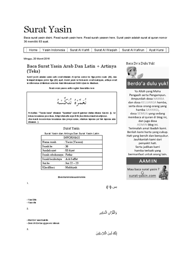Bacaan surat yasin ayat 1 sampai 83 lengkap (latin + terjemahan). 9 bacaan tahlil dan yasin lengkap. Mambacakan surat yasin dan tahlil merupakan sebuah amalan yang sudah umum di lakukan oleh sebagian besar kalangan umat islam indonesia khususnya yang temasuk pada masyarakat nahdliyin. Surat yasin merdu bikin nangis dalam teks arab, latin dan terjemahan indonesia, dilantunkan ole qori 2 yıl önce. Yasin surəsini oxuyan qorunar və ruzu əldə edər. Semoga kaukabulkan permohonan kami. baca juga: Setelah membaca surat yasin, dianjurkan melafalkan doa. 8 doa setelah baca yasin. Surat yasin full ( surat yasin lengkap ) 83 ayat dan artinya dan surah yasin latin, surat ini terdiri atas 83 ayat. Surat yasin adalah salah satu surat yang mungkin paling banyak dibaca oleh masyarakat di indonesia. Jika anda sedang membutuhkan surat yasin bahasa indonesia saja, silahkan anda cari surat yasin terjemahan pada blog ini. Surat yasin adalah salah satu surat didalam al qur'an nomor ke tiga puluh enam (36), dan terdapat delapan puluh tiga (83) ayat. Surat yasin ngandung ayat seueurna 83 ayat eusi pokok surat yasin nyaeta: