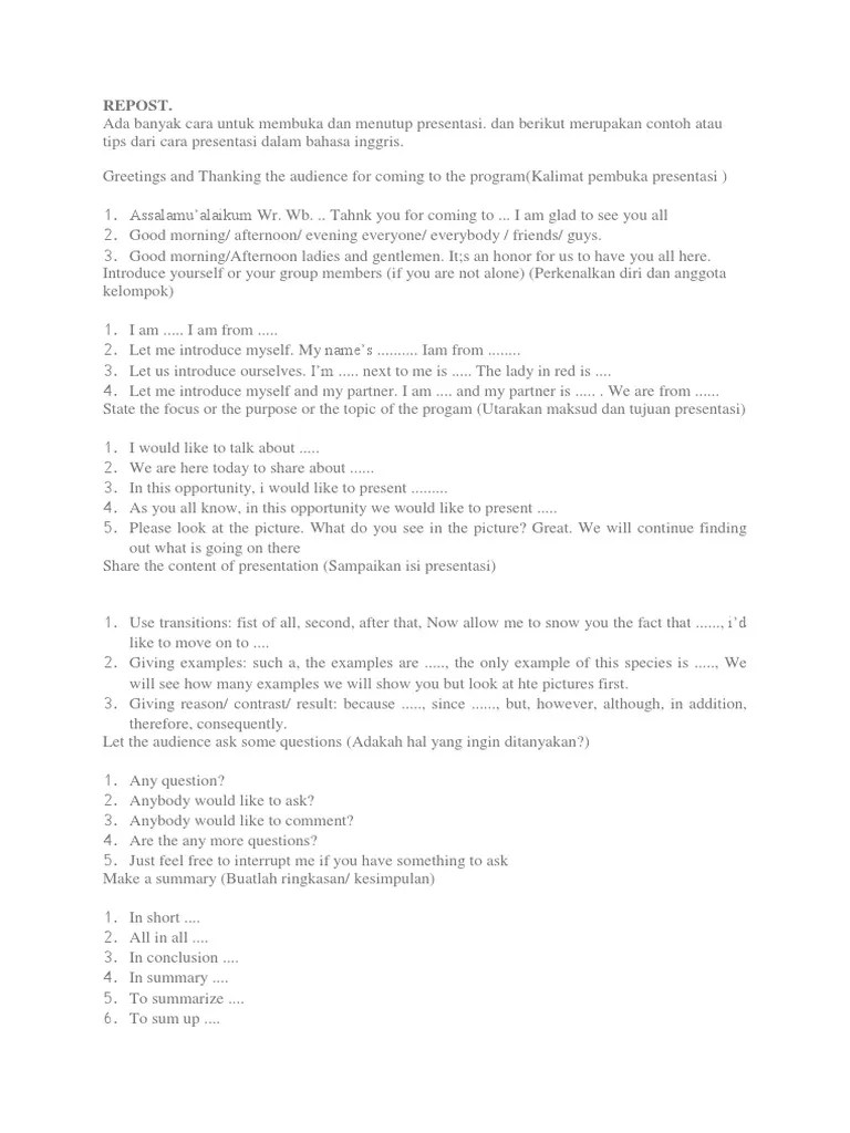 Kalimat yang anda gunakan dalam membuka satu presentasi akan menentukan suasana presentasi anda selanjutnya, dan akhirnya akan berkontribusi tujuan anda merebutperhatian pemirsa kadang anda perlu mendramatisir pemirsa, mendramatisir.ini merupakan teknik pembuka yang sangat efektif. Berdasarkan strukturnya, jenis kalimat bahasa inggris dapat dibagi menjadi 3 (tiga) macam yaitu. Inggris nya kamu cantik 2.apa b. Kalimat positif atau sering disebut juga kalimat pernyataan dalam bahasa inggris adalah kalimat yang tidak terdapat pengingkaran atau penyangkalan, sehingga pernyataan yang diungkapkan. Pernahkah kamu merasa kesulitan saat membuat imperative sentences? Pada kesempatan kali ini kosngosan akan memberikan beberapa contoh kalimat pembuka dan penutup presentasi singkat baik yang ada di kelas atau pun. Sebagai contohnya, berikut ini adalah penggunaan statistik dalam pembukaan presentasi bahasa inggris. Langkah pertama adalah greetings atau salam pembuka: Yang menjadi masalah adalah presentasi itu harus disampaikan dalam bahasa inggris. Presentasi bahasa inggris, kalimat pembuka presentasi bahasa inggris, dialog pembukaan presentasi bahasa inggris, pembukaan presentasi, pembukaan presentasi dengan bahasa inggris, contoh pembukaan. Berikut ini admin akan memberikan contoh kalimat pembuka pada rapat untuk sahabat kbi beserta dengan arti lengkap. Presentasi bahasa inggris menjadi hal yang penting untuk dikuasai. Kali ini kita akan belajar dengan miss firda yang merupakan teacher.